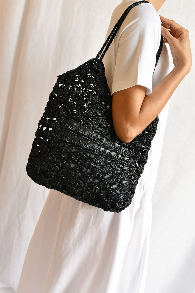 The Anemone Tote - a crochet raffia tote bag, delicately handcrafted with luxurious Italian viscose raffia, a plant-based and fully biodegradable fiber. A modern take on retro style, the Anemone tote highlights our attention to fine detail.
